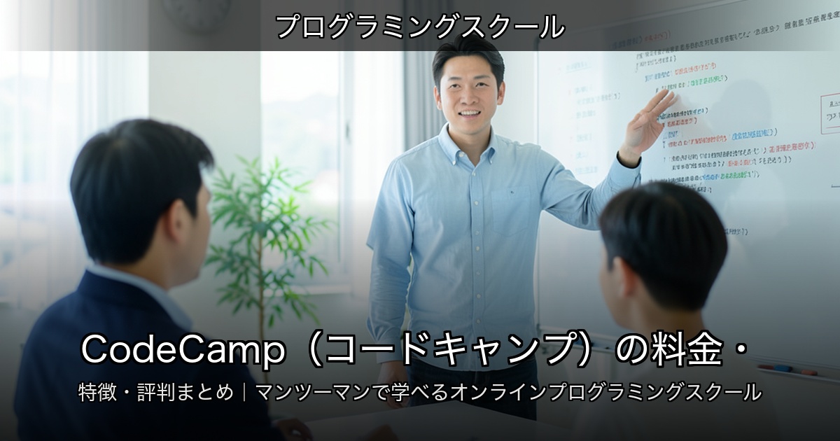 CodeCamp(コードキャンプ)は、オンライン完結のマンツーマンレッスンを中心に学べるプログラミングスクールです。自宅から受講でき、レッスン時間も朝から夜まで幅広く用意されているため、仕事や家事と並行しながら学習計画を立てたい人にとって検討し...