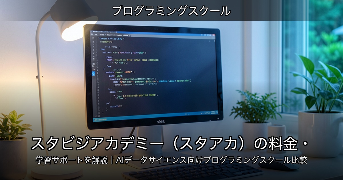 スタビジアカデミー(スタアカ)は、データサイエンス、Python、SQL、統計、機械学習、生成AIをオンラインで学べる学習サービスです。一般的なWebアプリ開発スクールというより、データ分析やAI活用を仕事に取り入れたい人向けの色が強いプログラミングス...